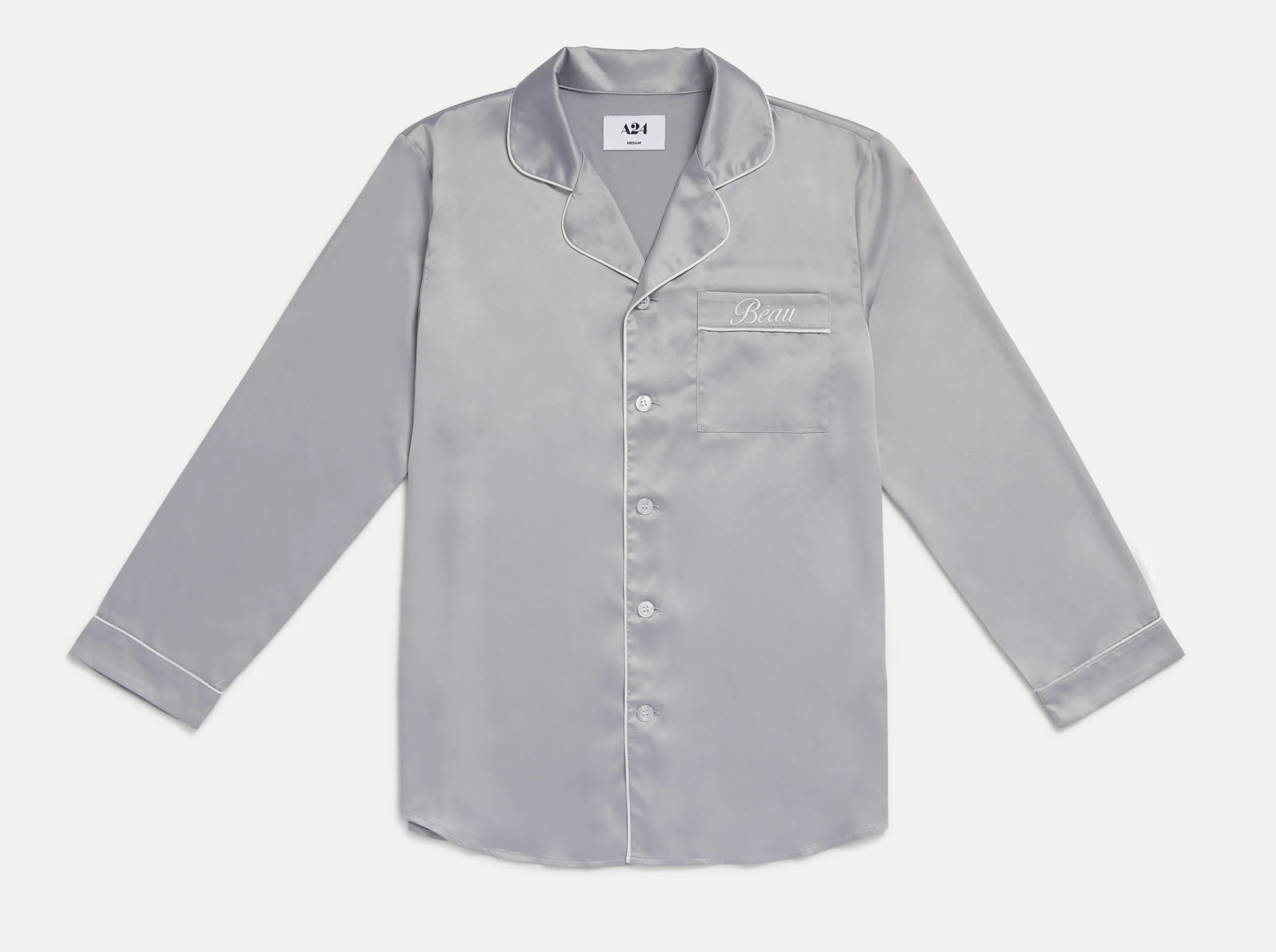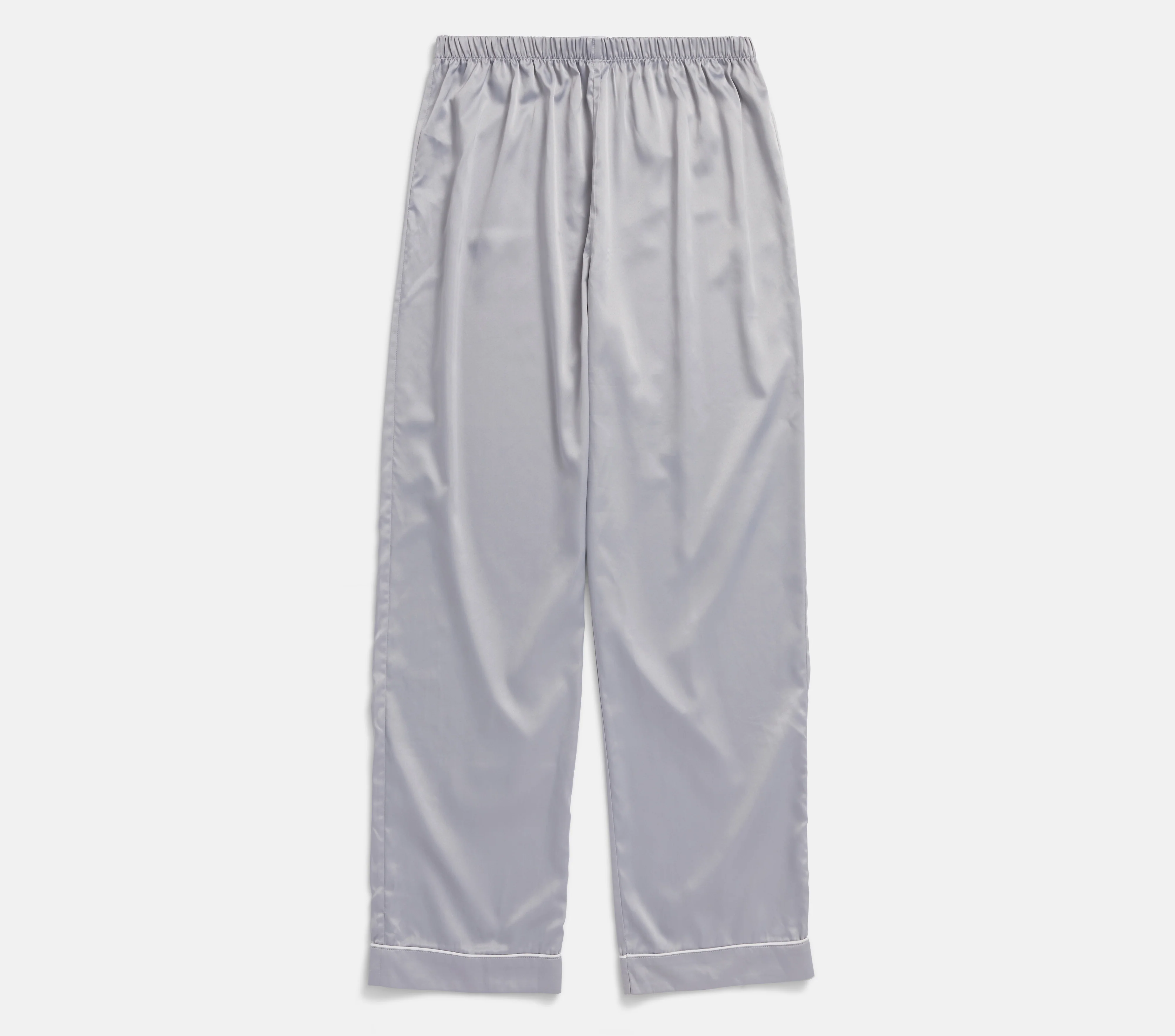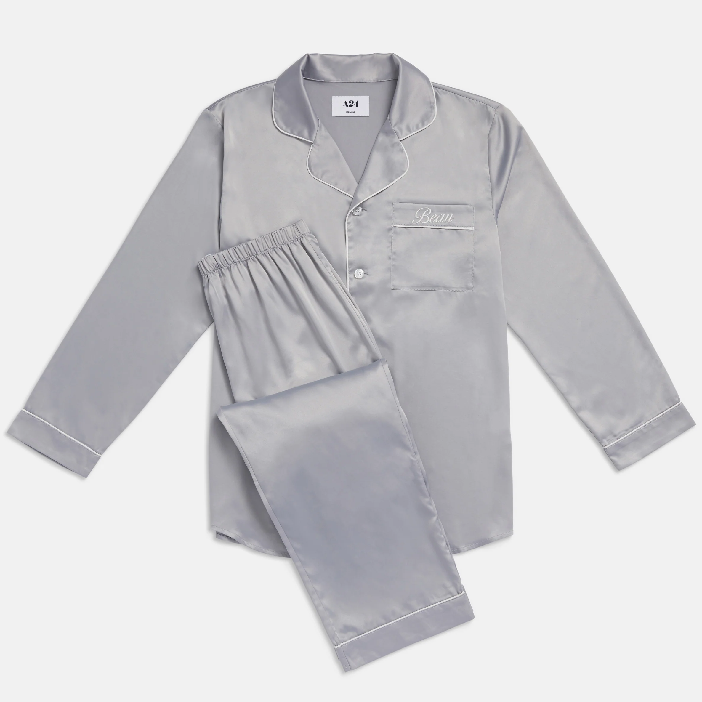Grey satin chiffon pajama set with white piping and embroidery. Oversize fit.