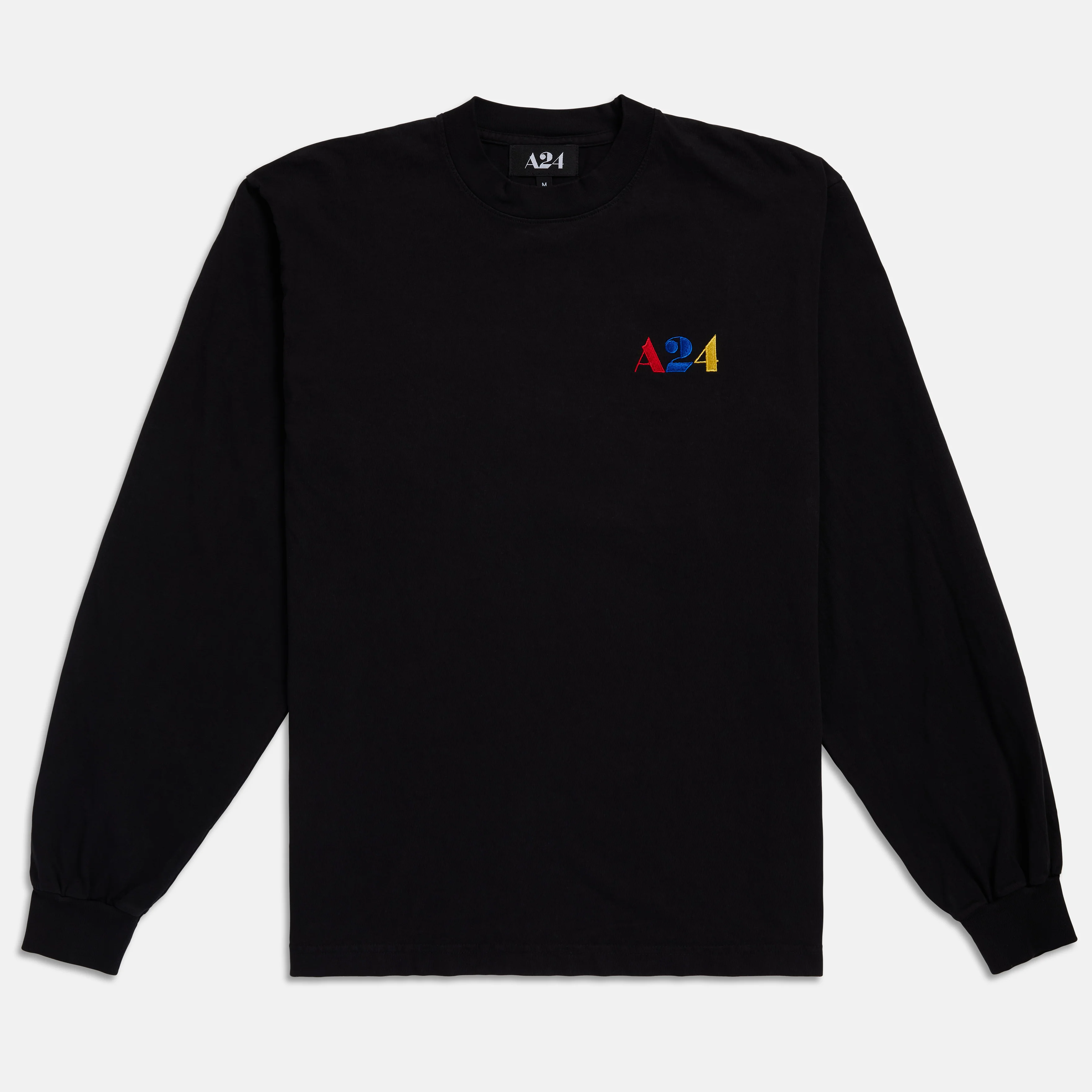 Black long sleeve tee with embroidered primary color logo on left chest.Ā