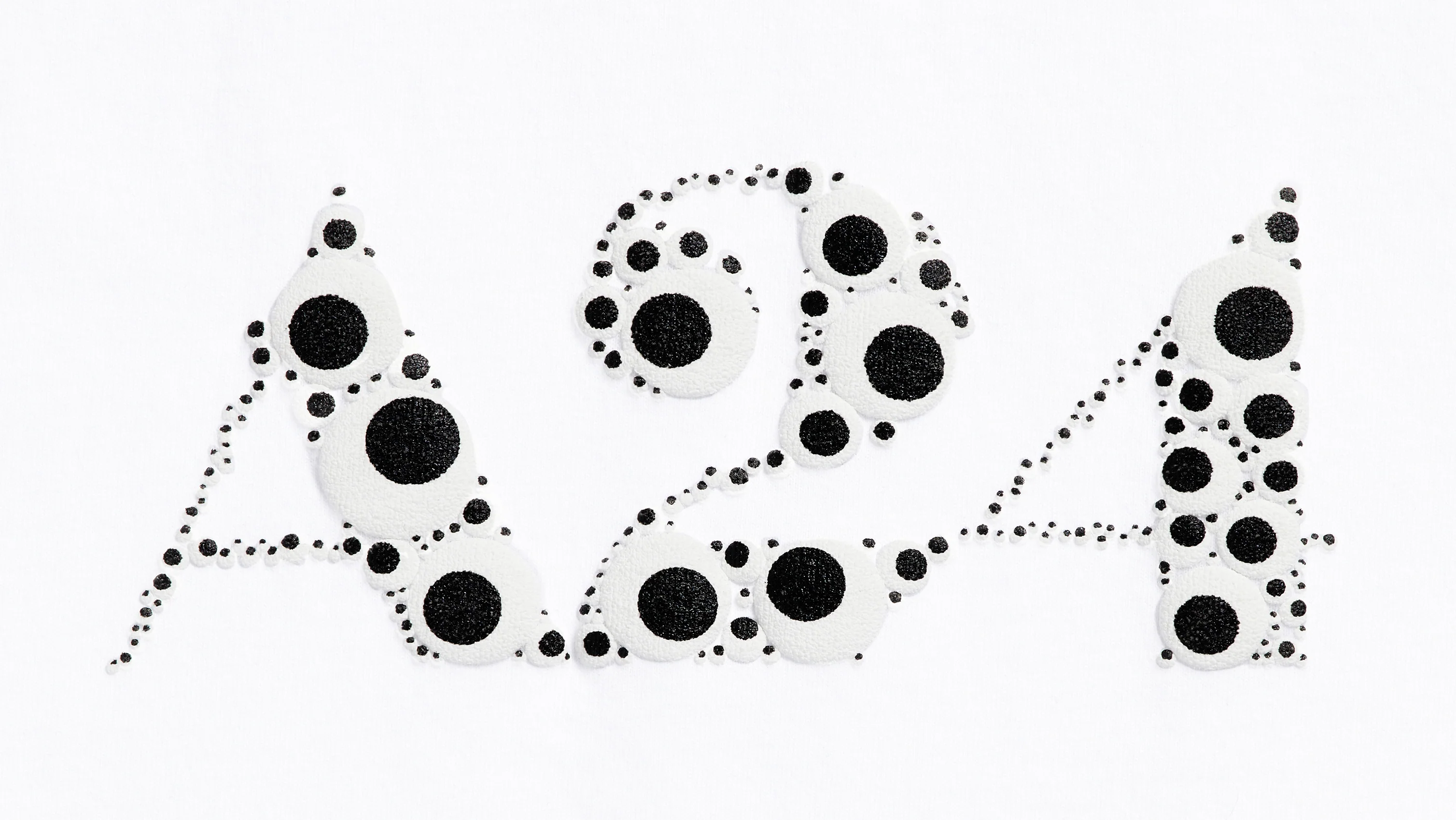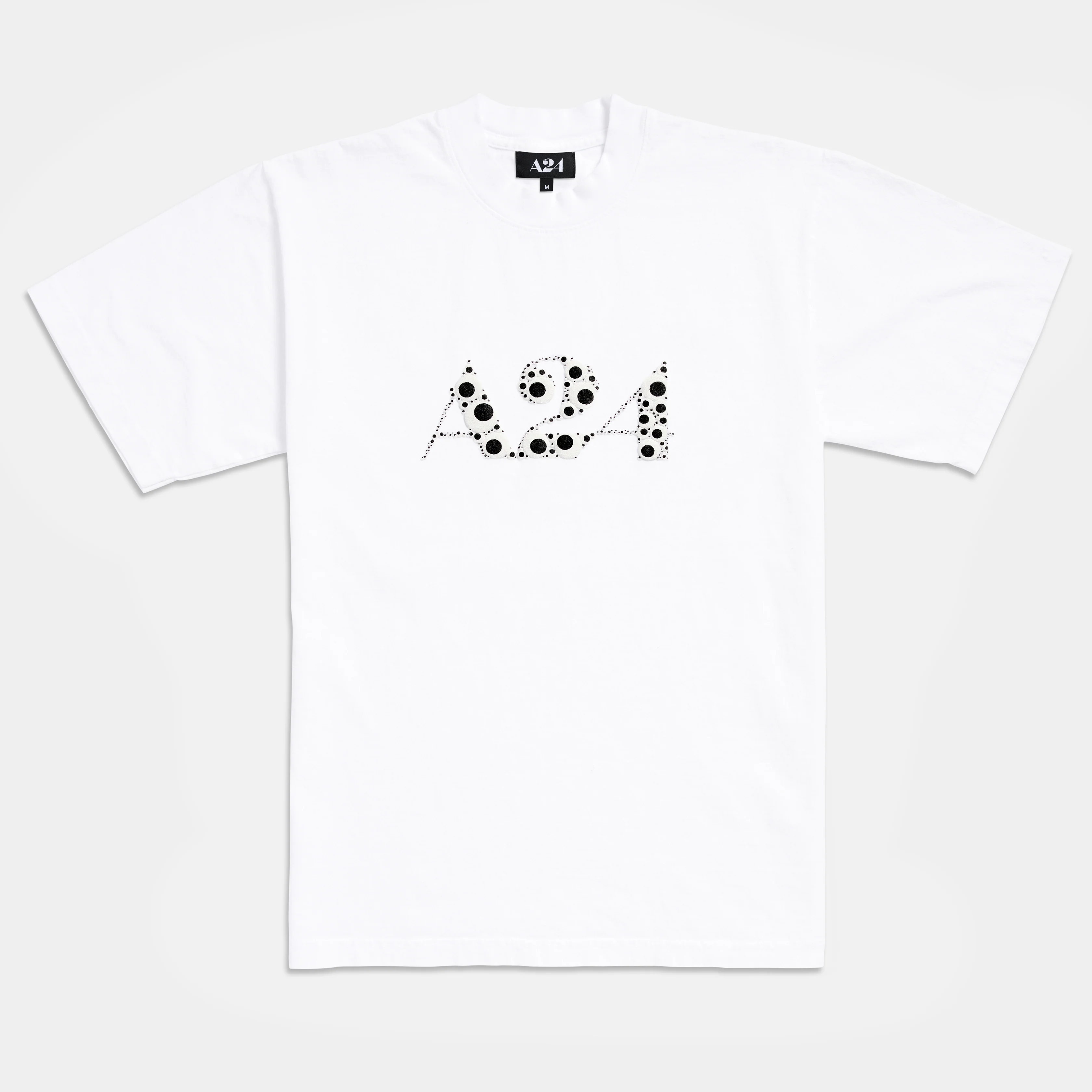 White puff print t-shirt featuring googly eye logo from Everything Everywhere All at Once.