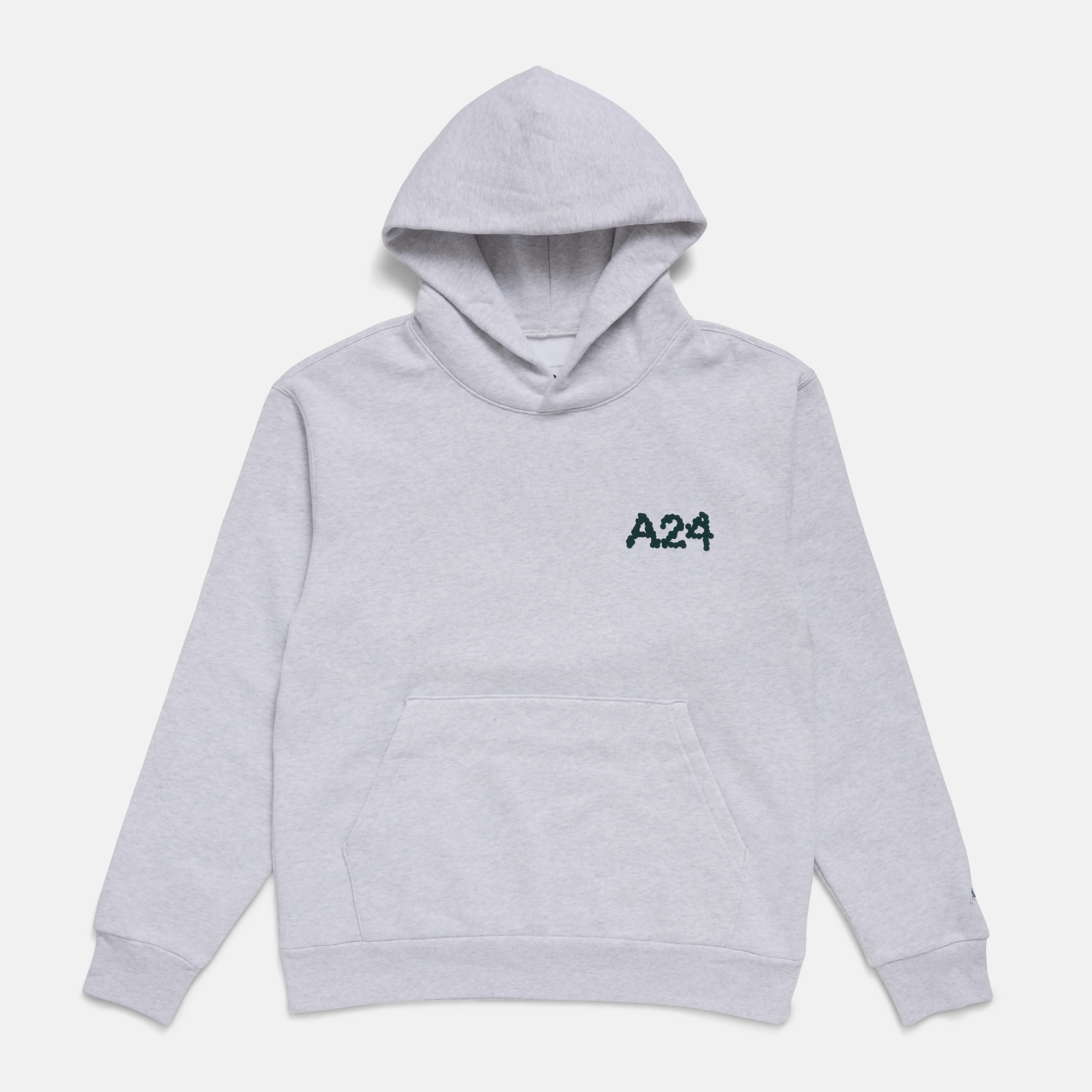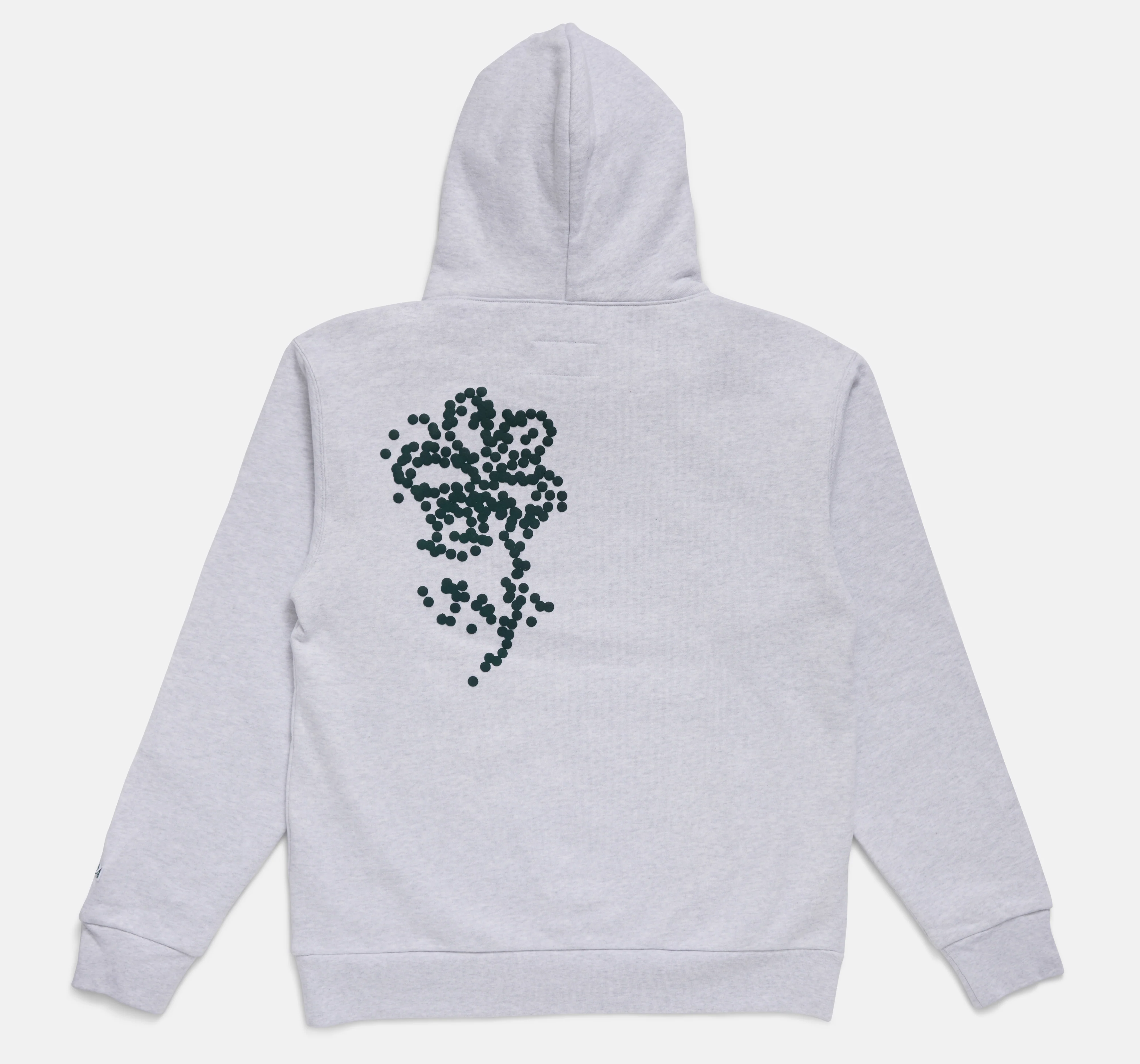 Heather grey hoodie with dark green puff print detailing. 100% organic cotton. Artwork by Crystal Zapata.