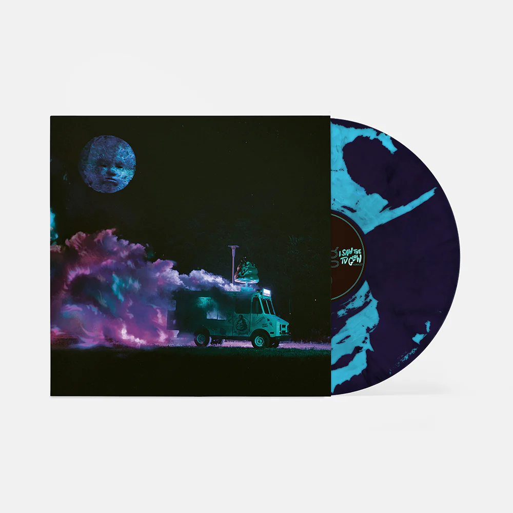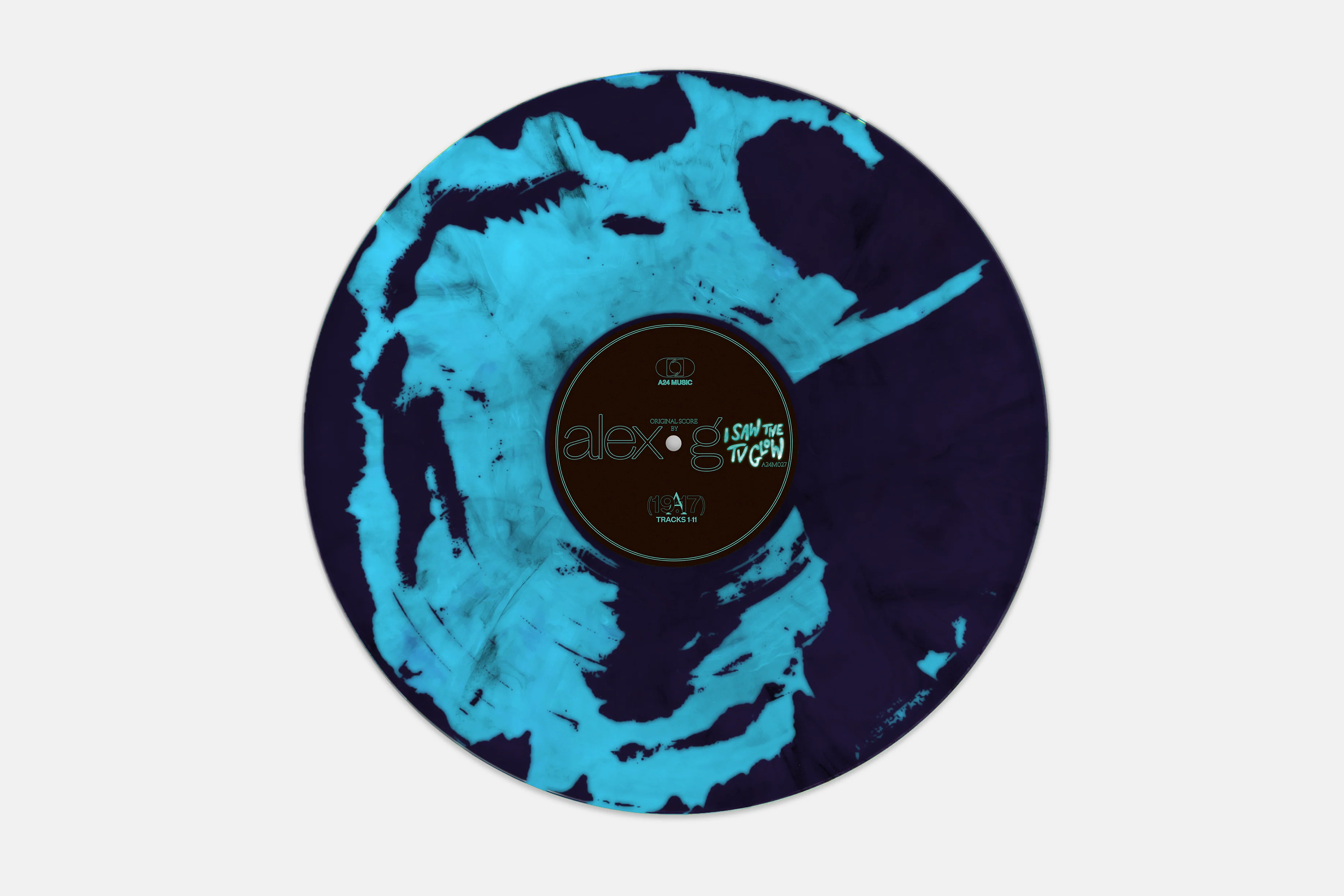 Limited edition pressing of Alex Gās Original Score for I Saw the TV Glow, pressed on blue glow vinyl and featuring a holographic cover and Mr. Melancholy sticker.