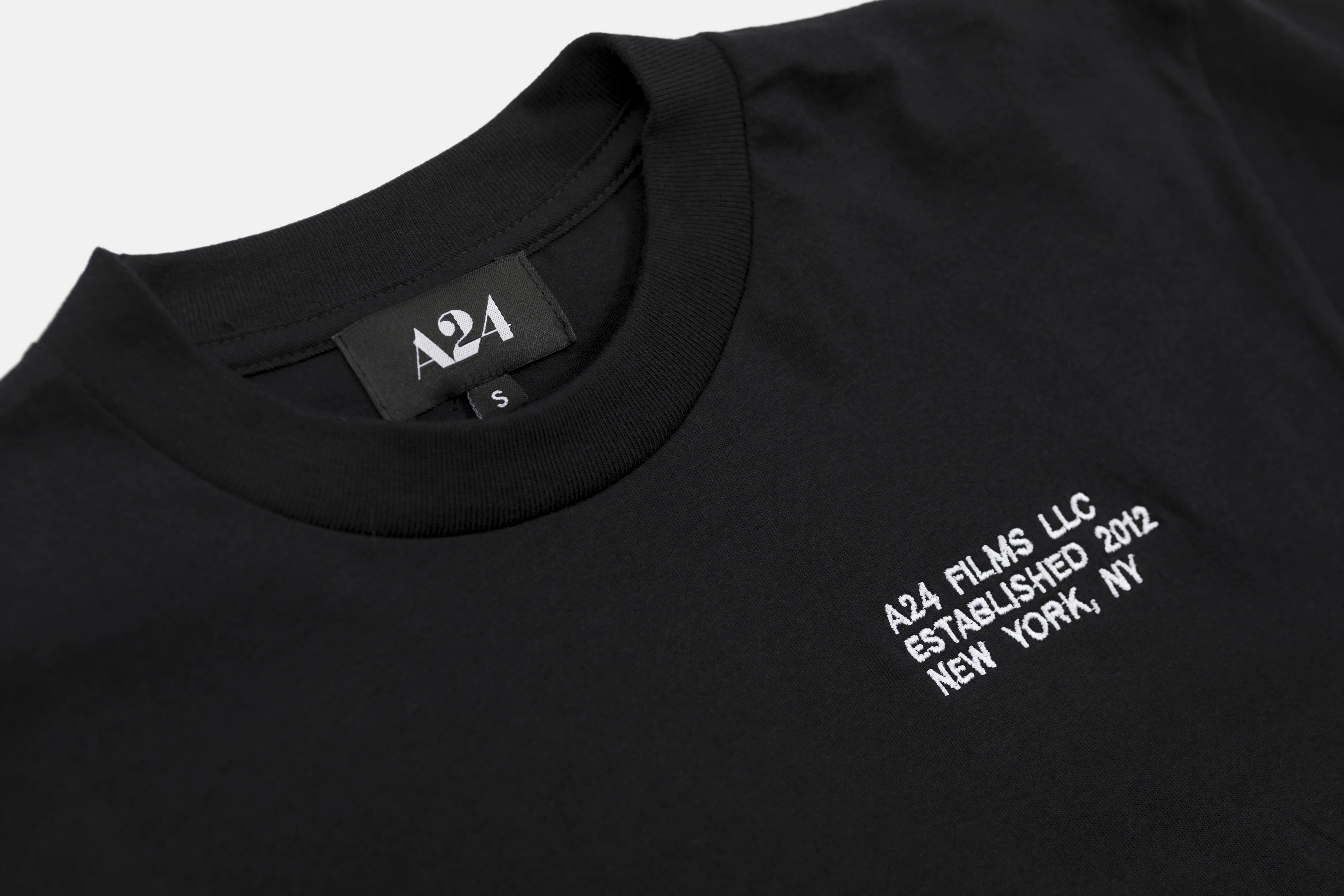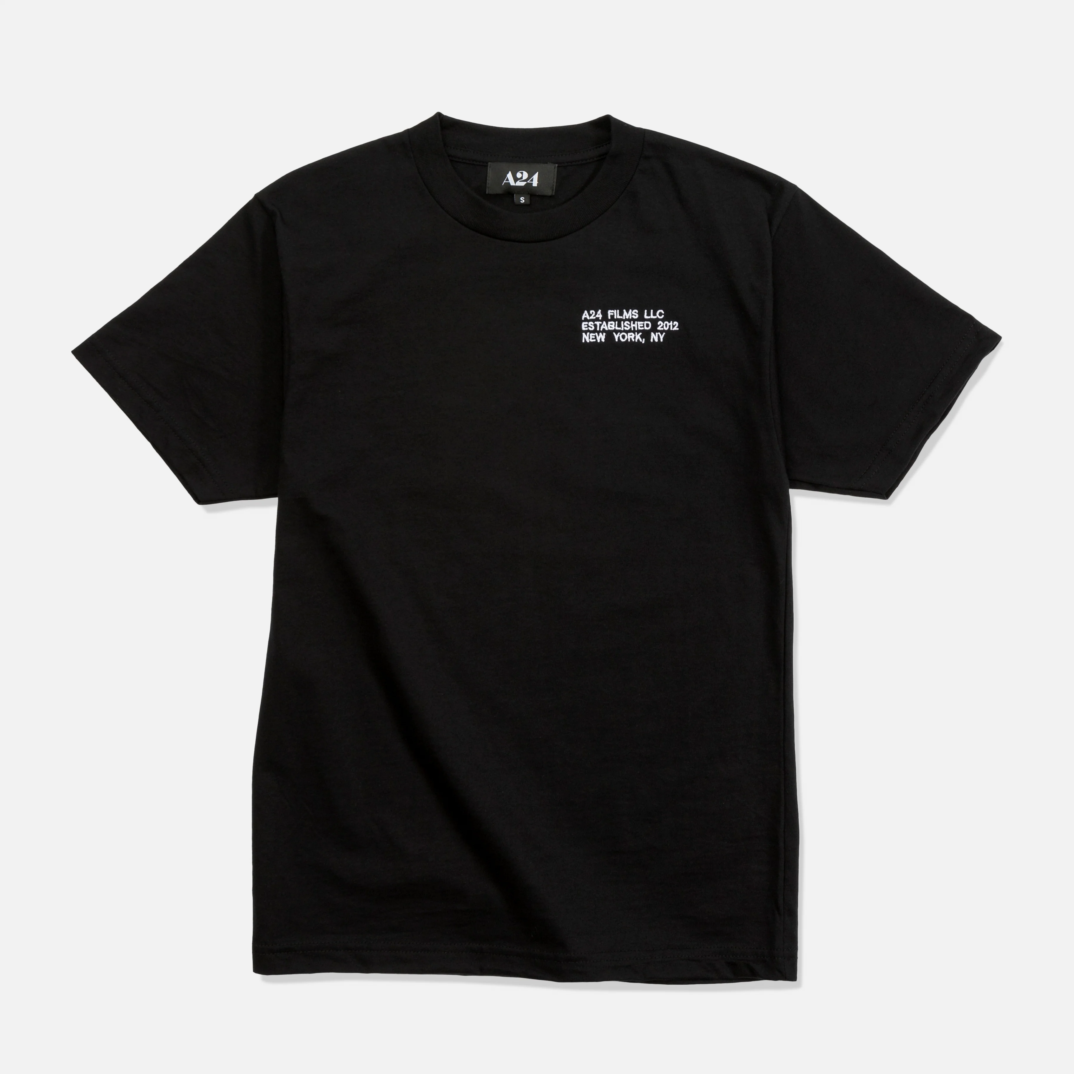 Black short sleeve cotton t-shirt with white embroidery on left chest and A24 woven label inside. Fits true-to-size.Ā