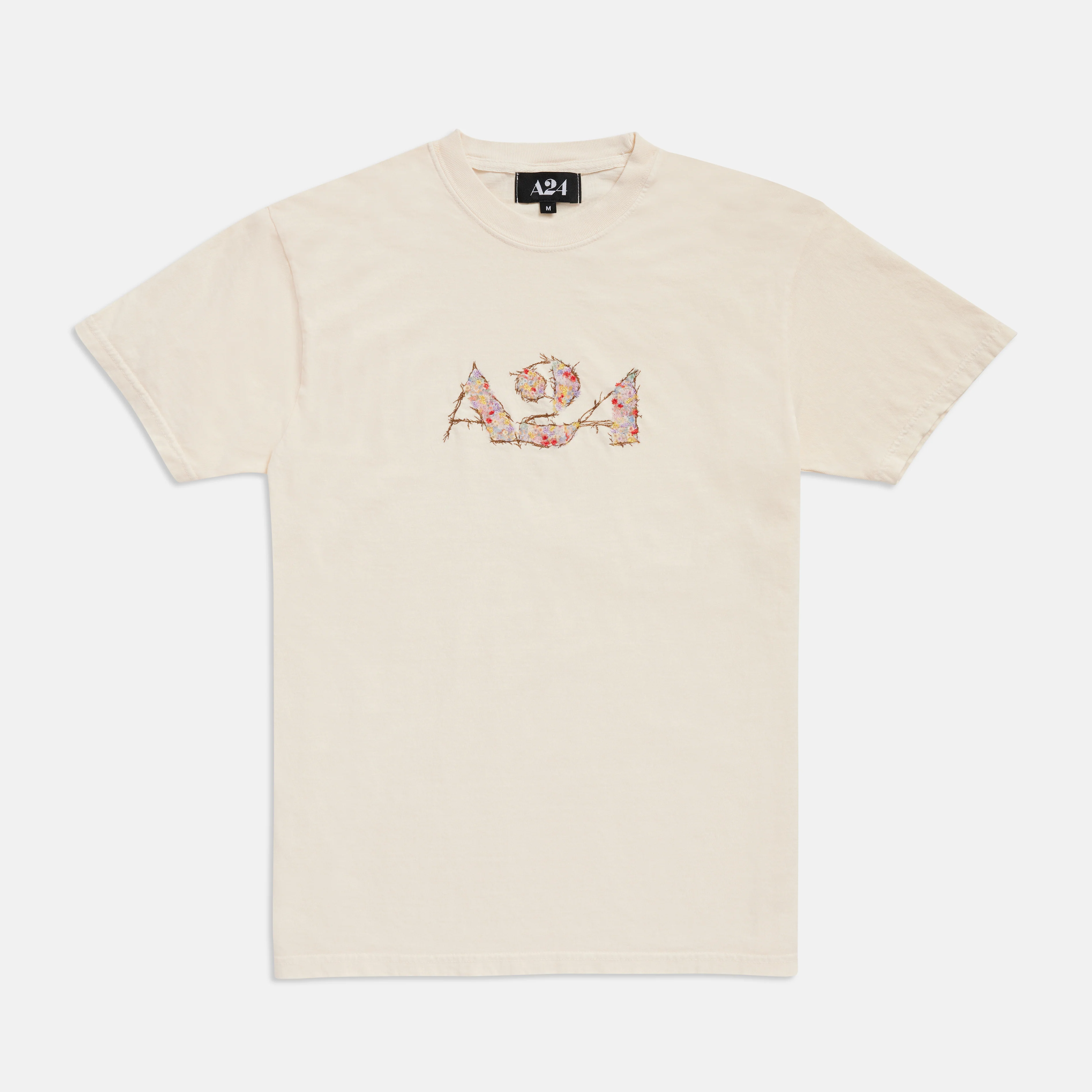 Four color embroidered logo on hand-dyed, short sleeve cotton t-shirt. A24 woven label inside. Fits true-to-size.Ā