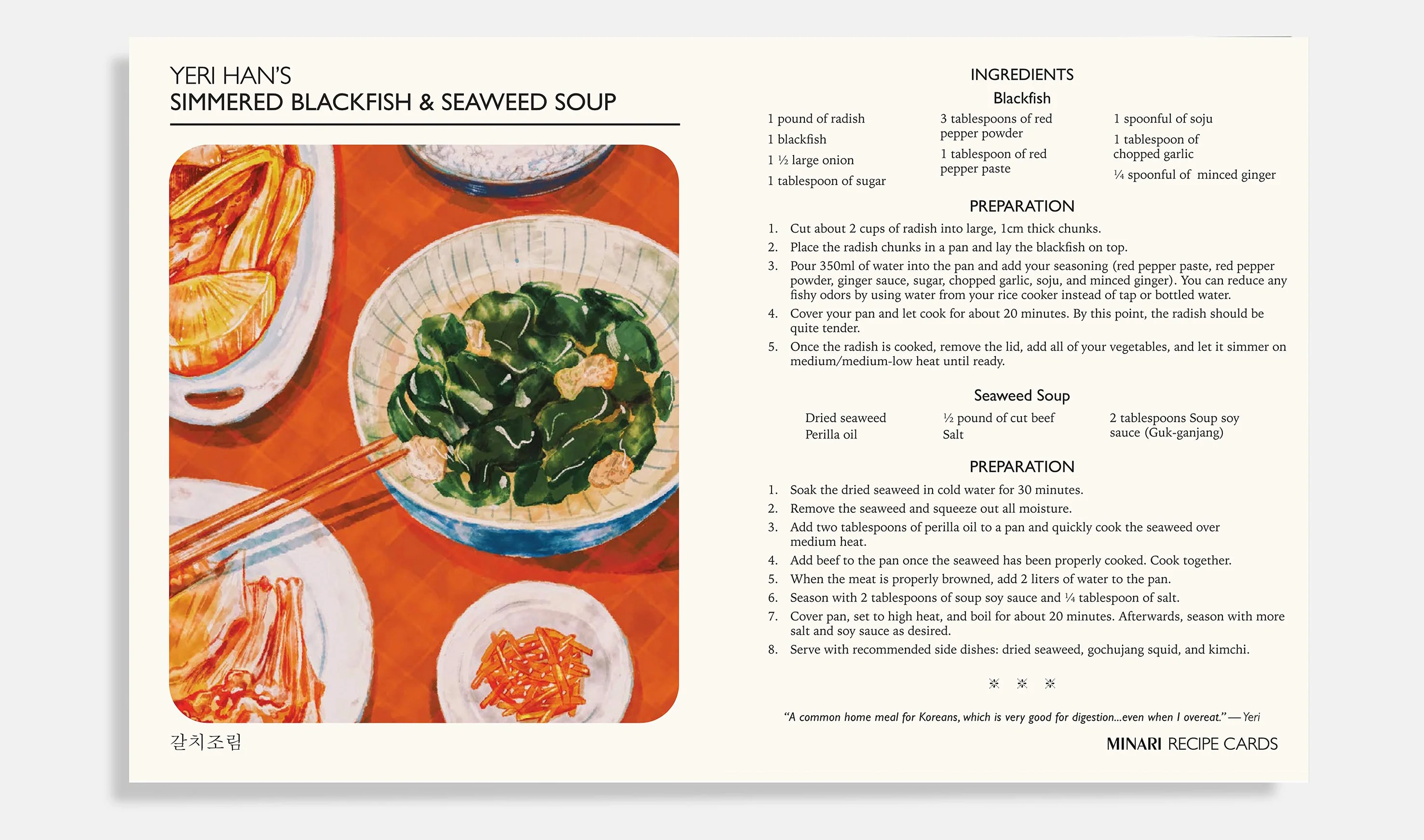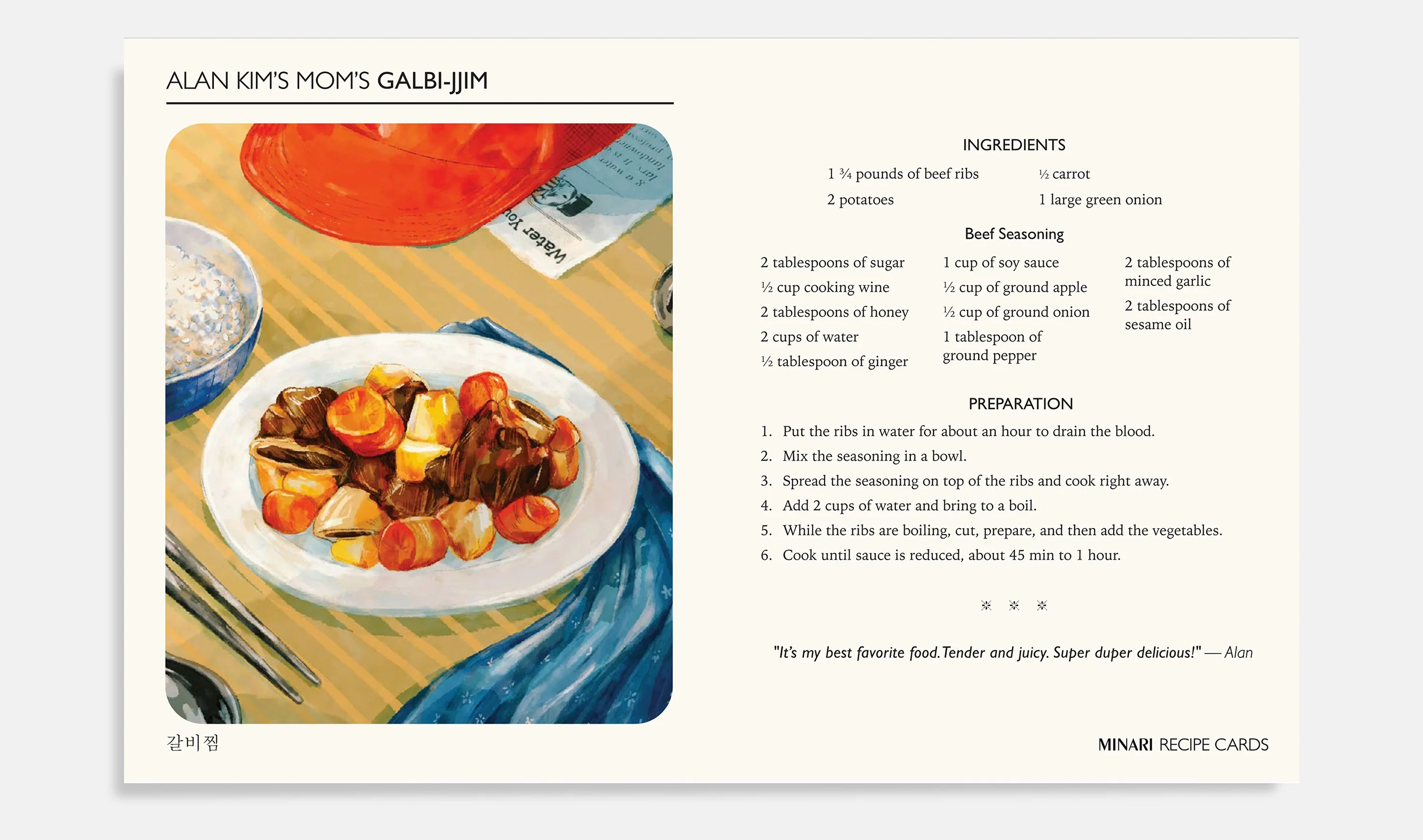 From theĀ Minari family table to yours.Ā 10 very special recipes from Lee Isaac Chung and the cast, with original illustrations by Naomi Otsu.