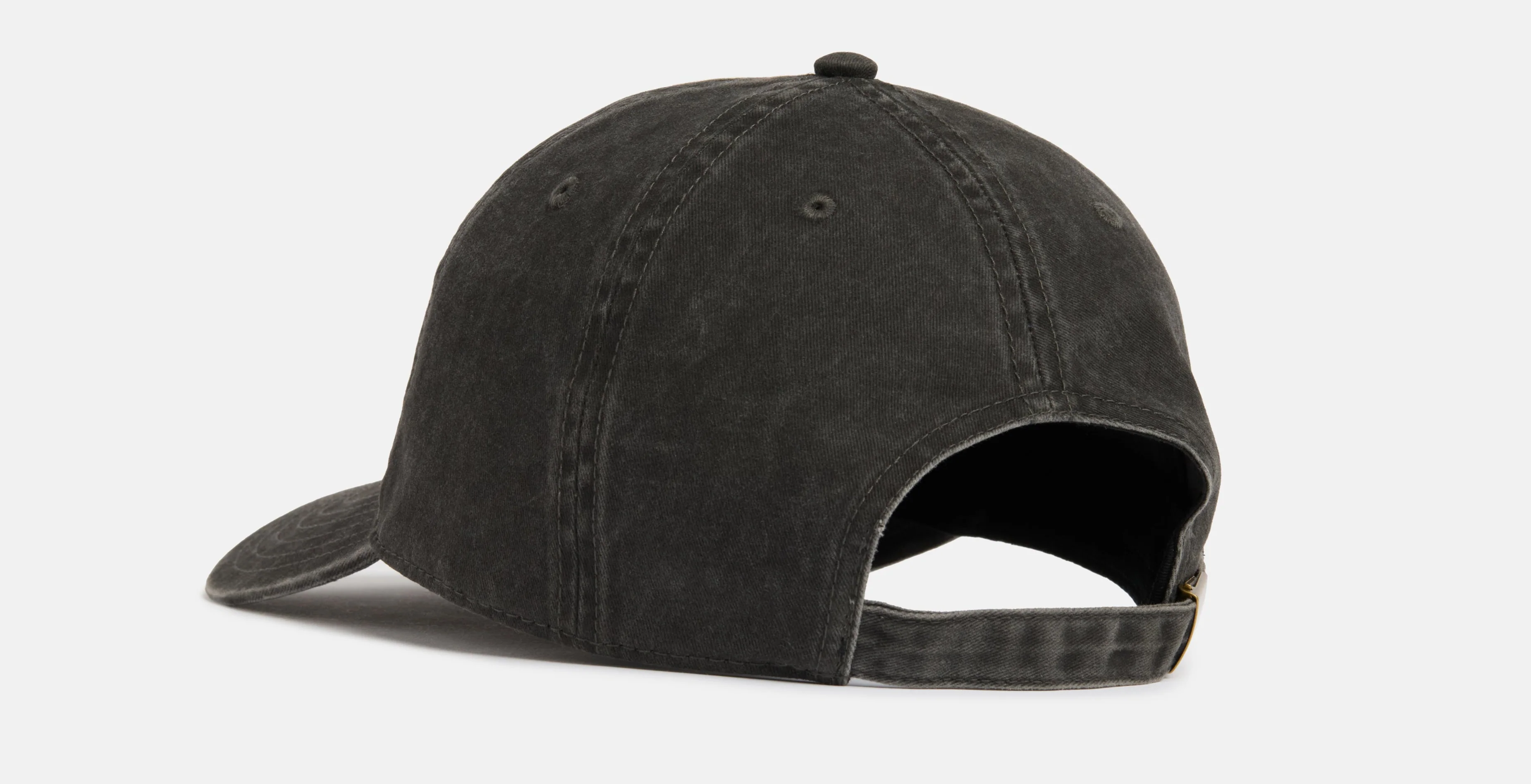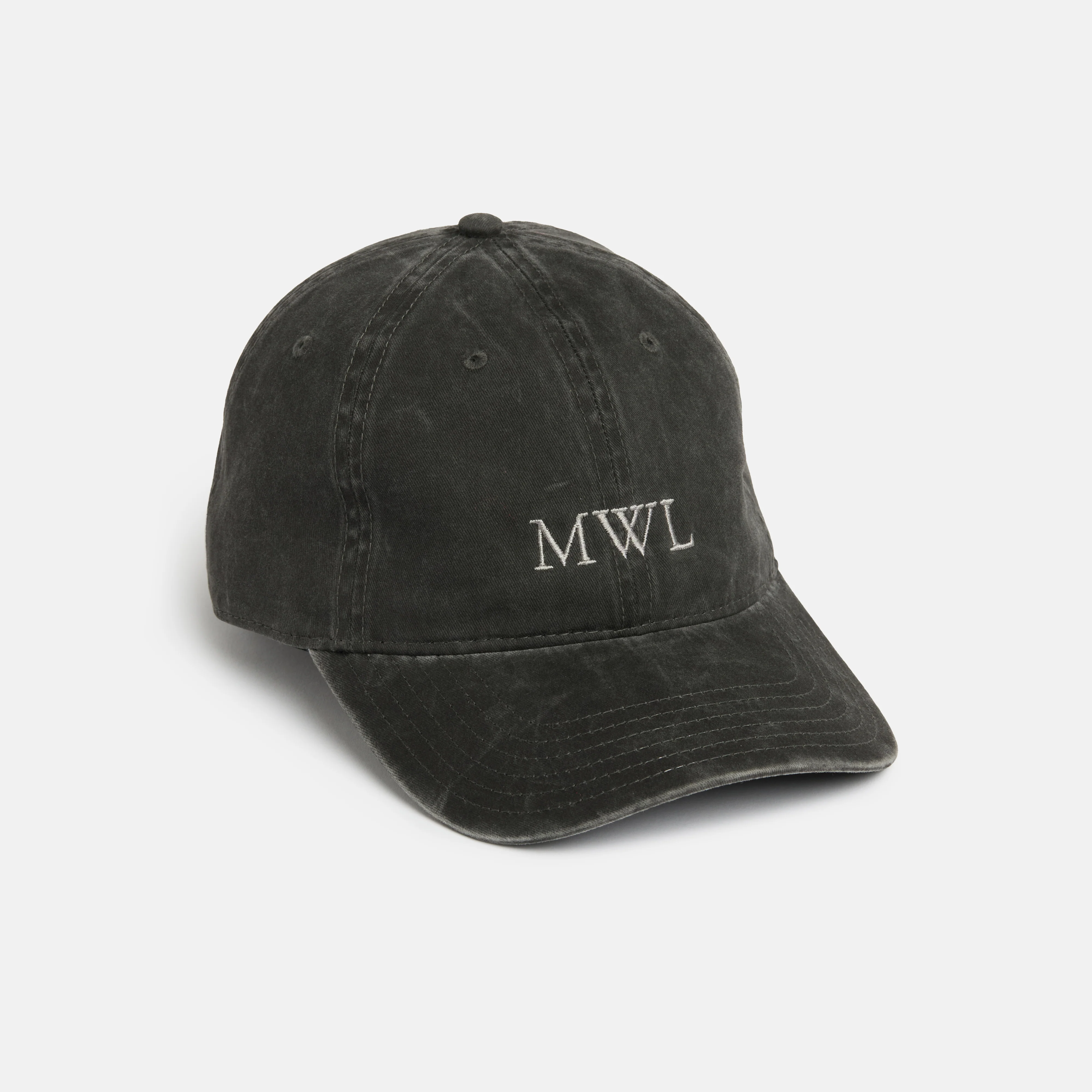 Washed-out black, structured lightweight cotton twill cap with adjustable strap. Gray embroidered Mark William Lewis monogram on the front.