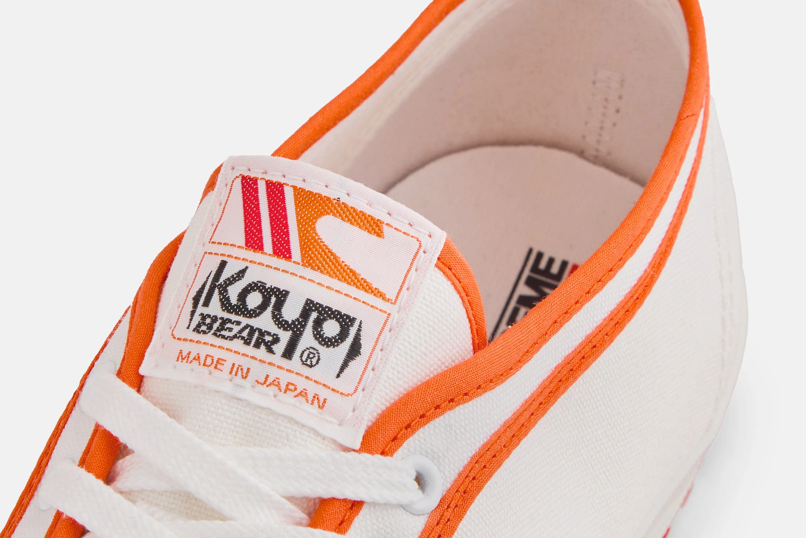 White cotton canvas with orange trim, vulcanized rubber sole and woven tongue label. Handmade in Japan.