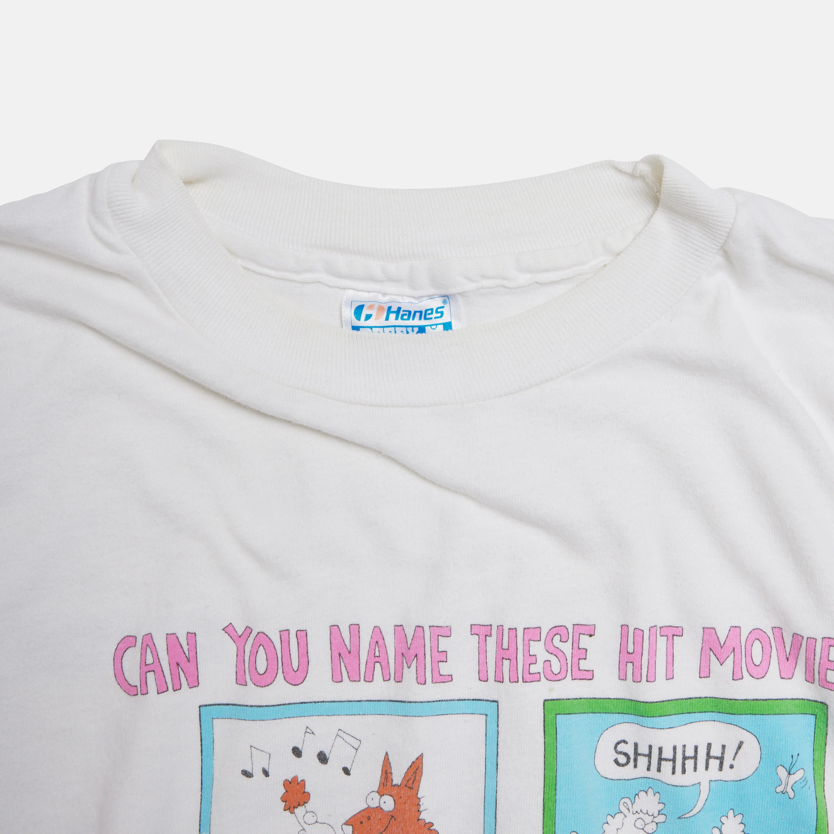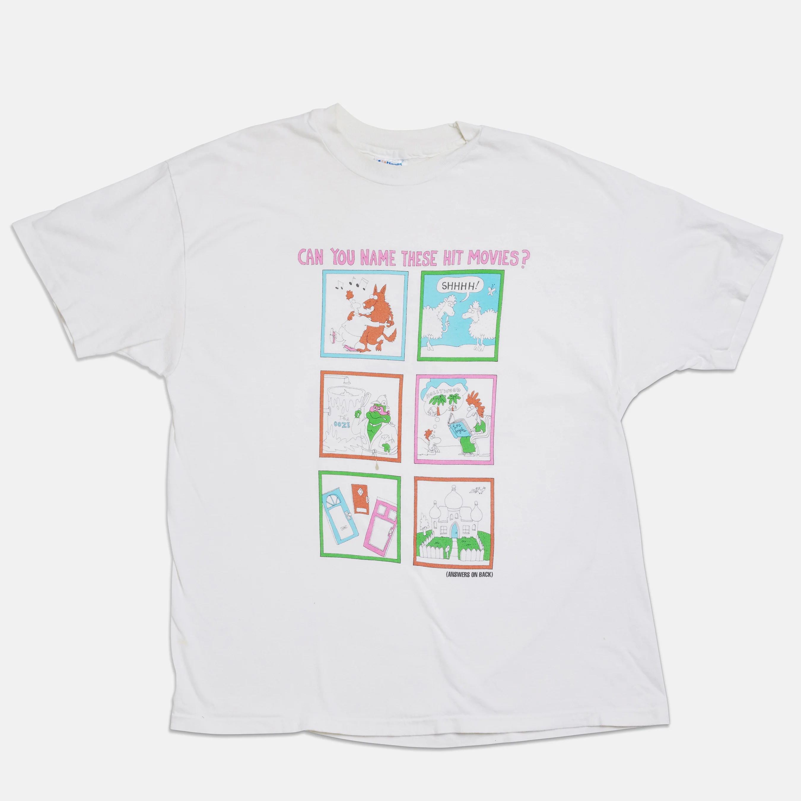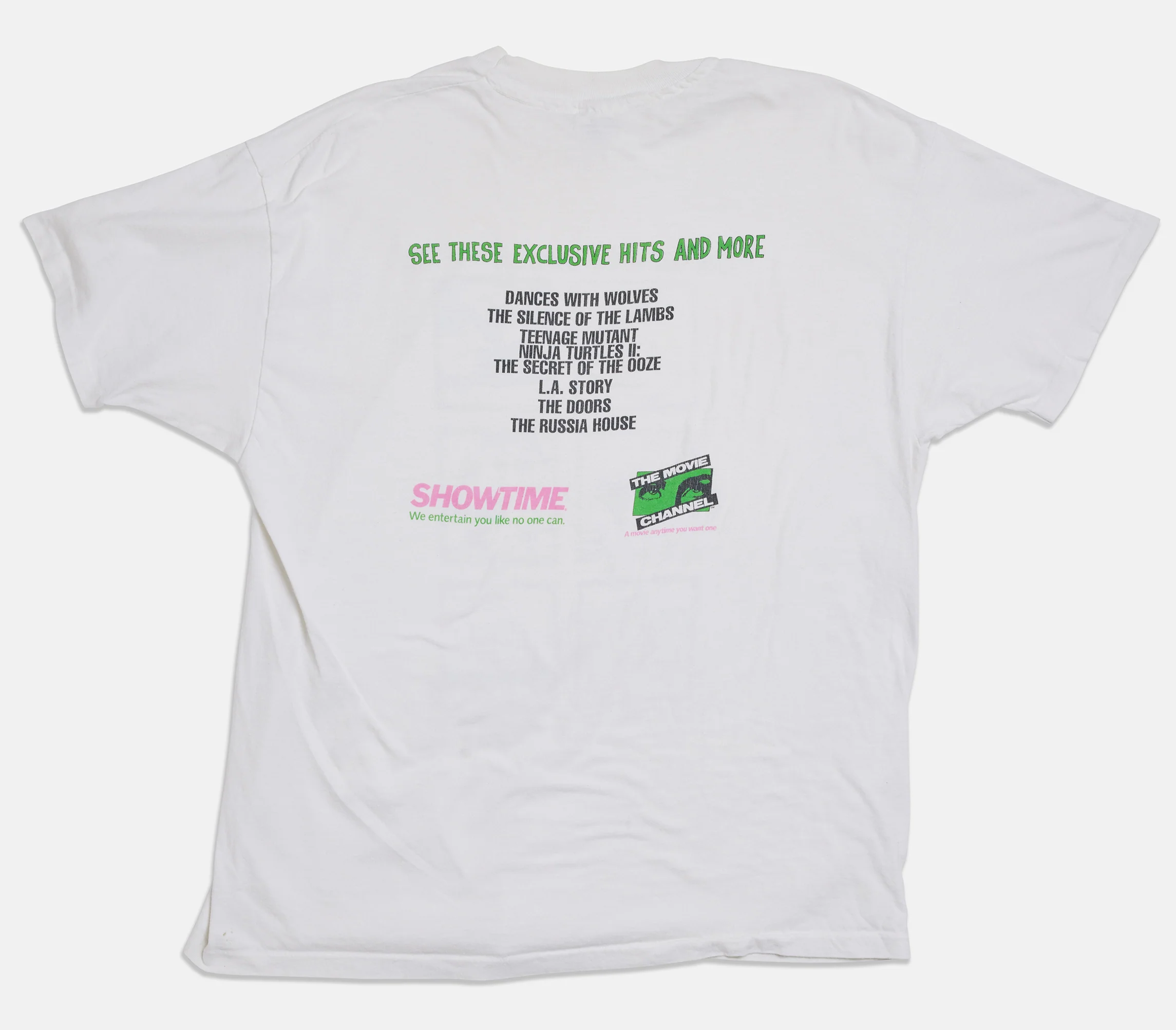 "Can you name these hit movies?" Showtime promotional t-shirt (1990) with cartoon illustrations on front. Great vintage condition with a small paint spot on front.