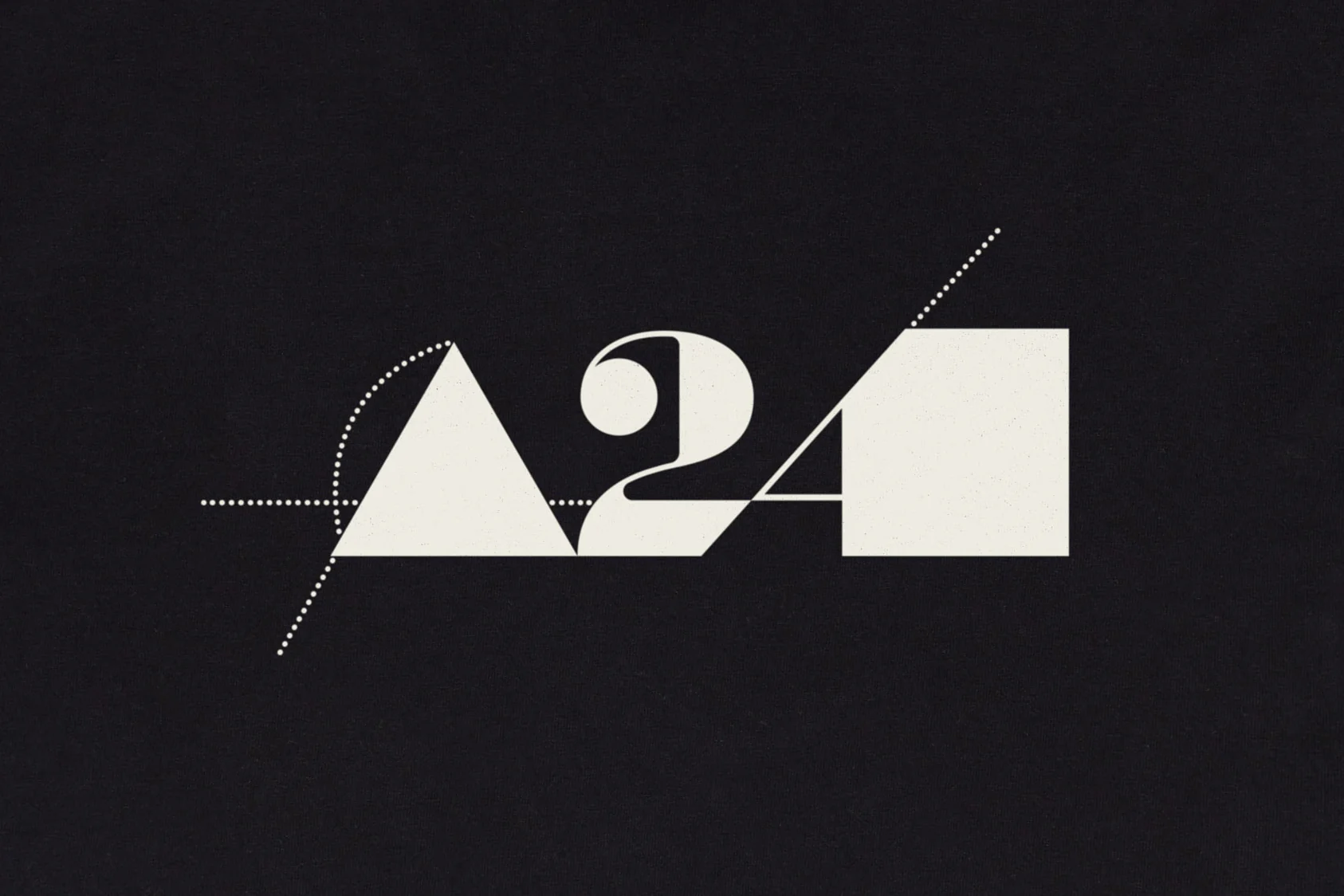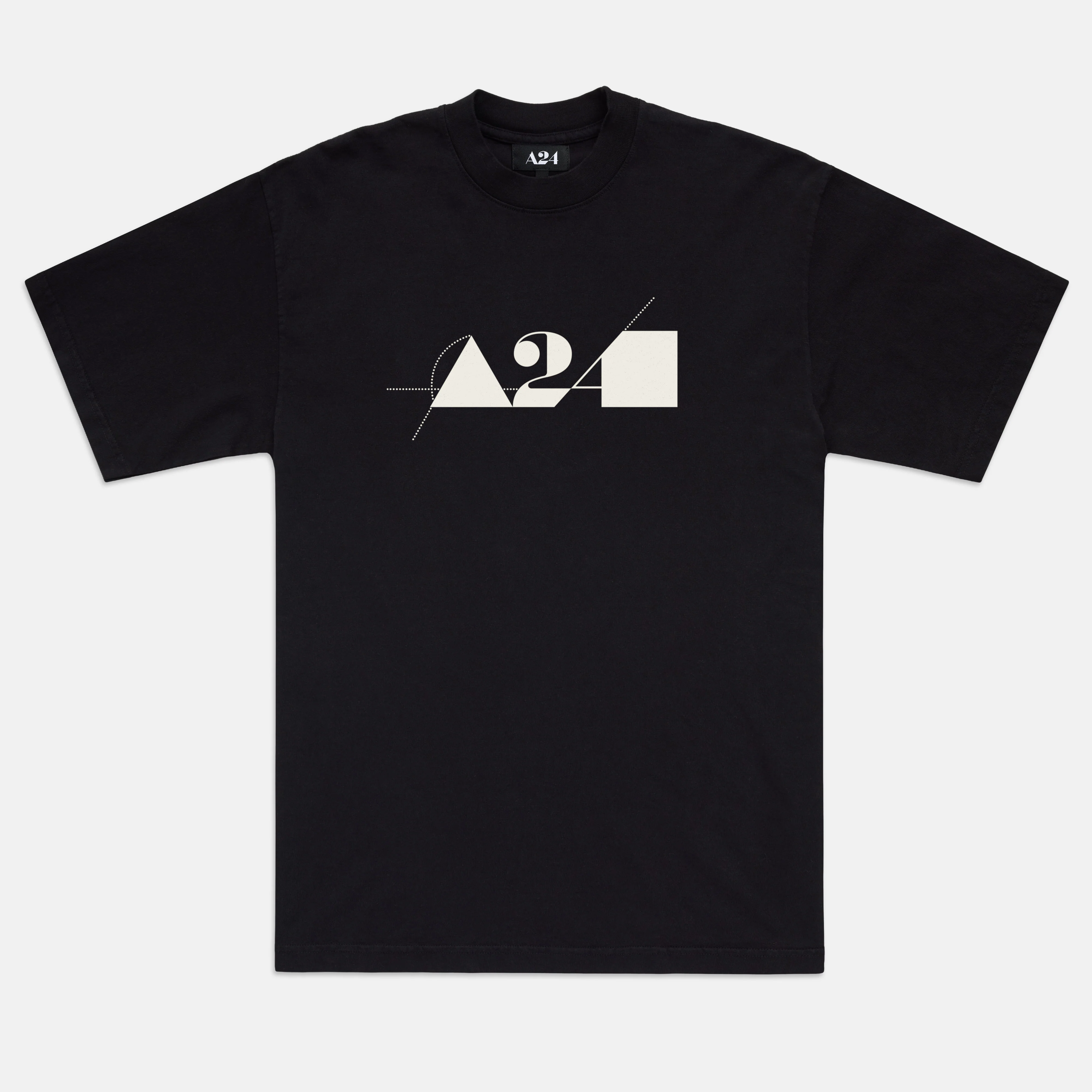 Black short sleeve t-shirt with screen printed Bauhaus-style A24 logo from The Brutalist.
