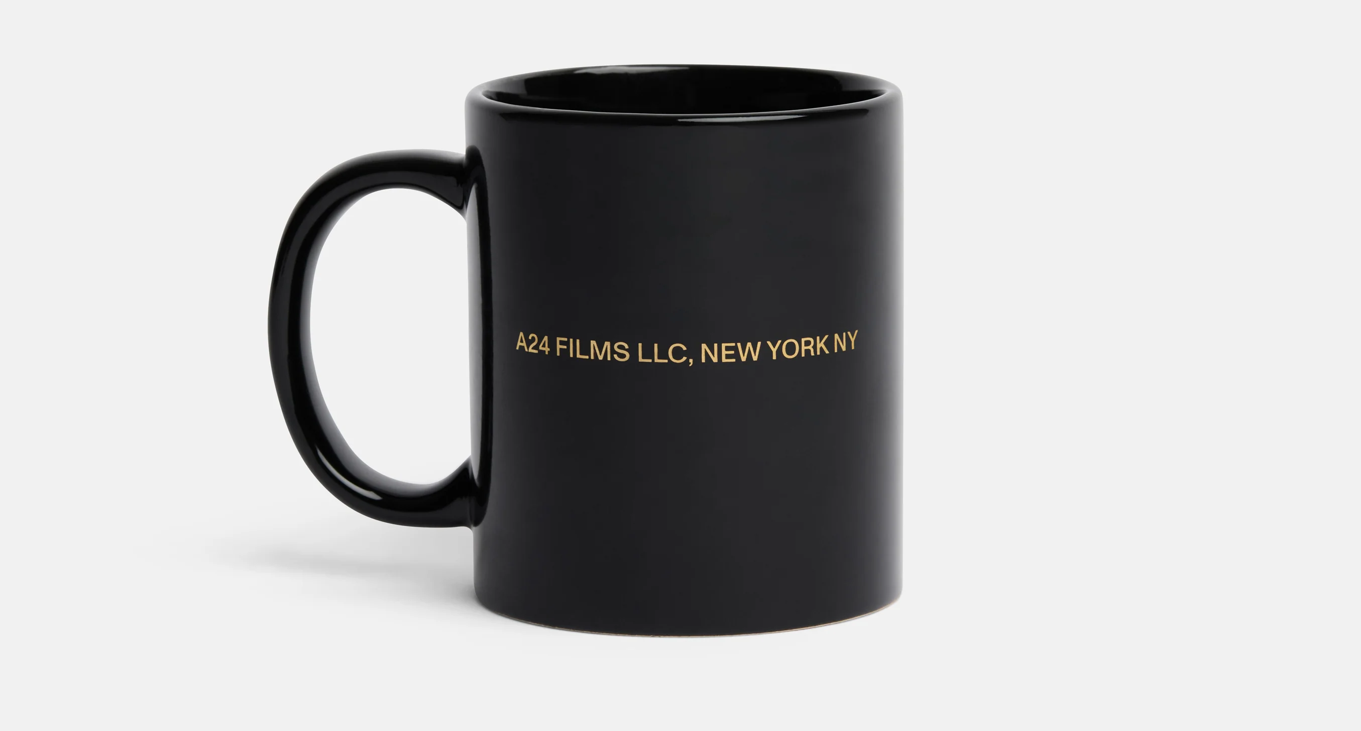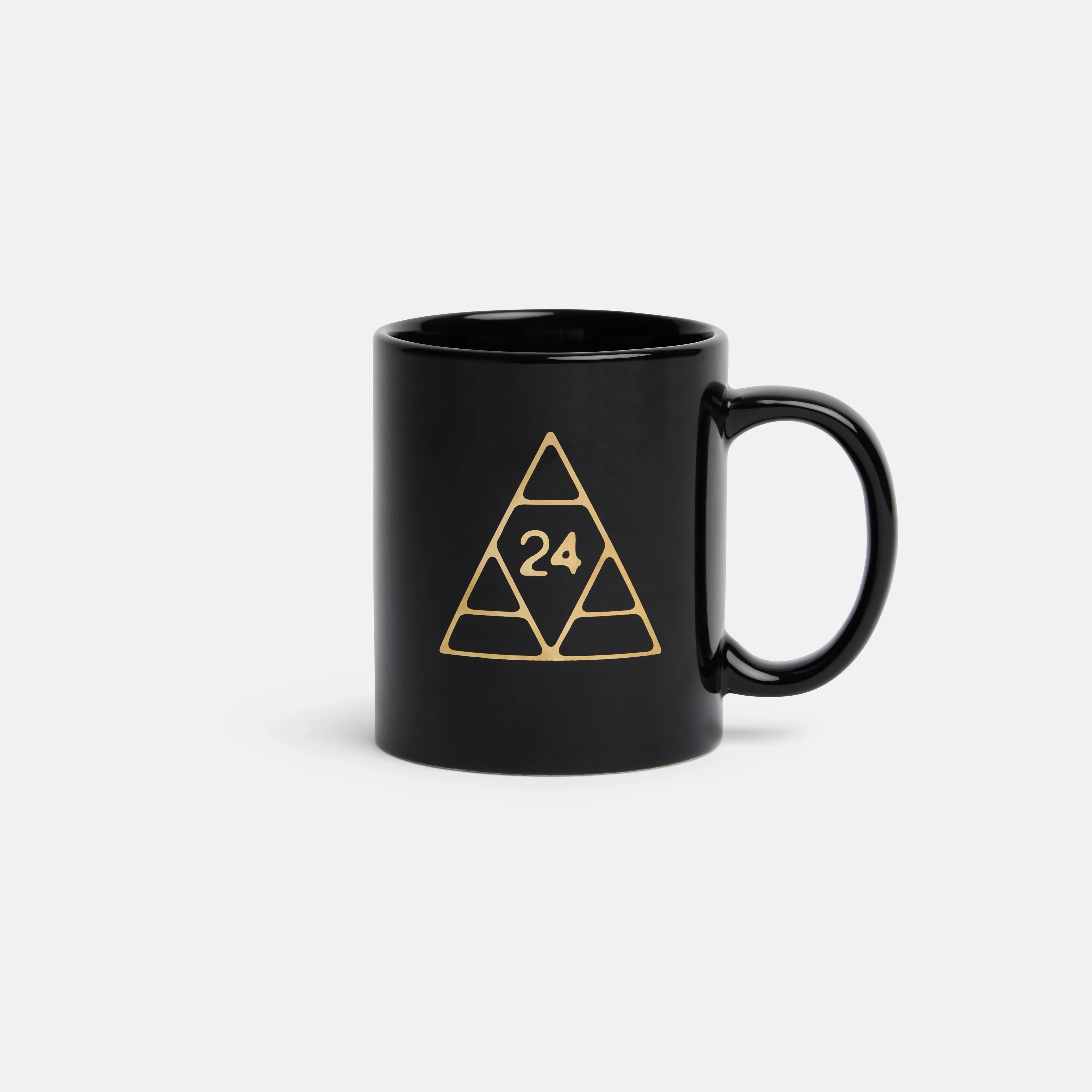 Black ceramic mug with printed logo and text.