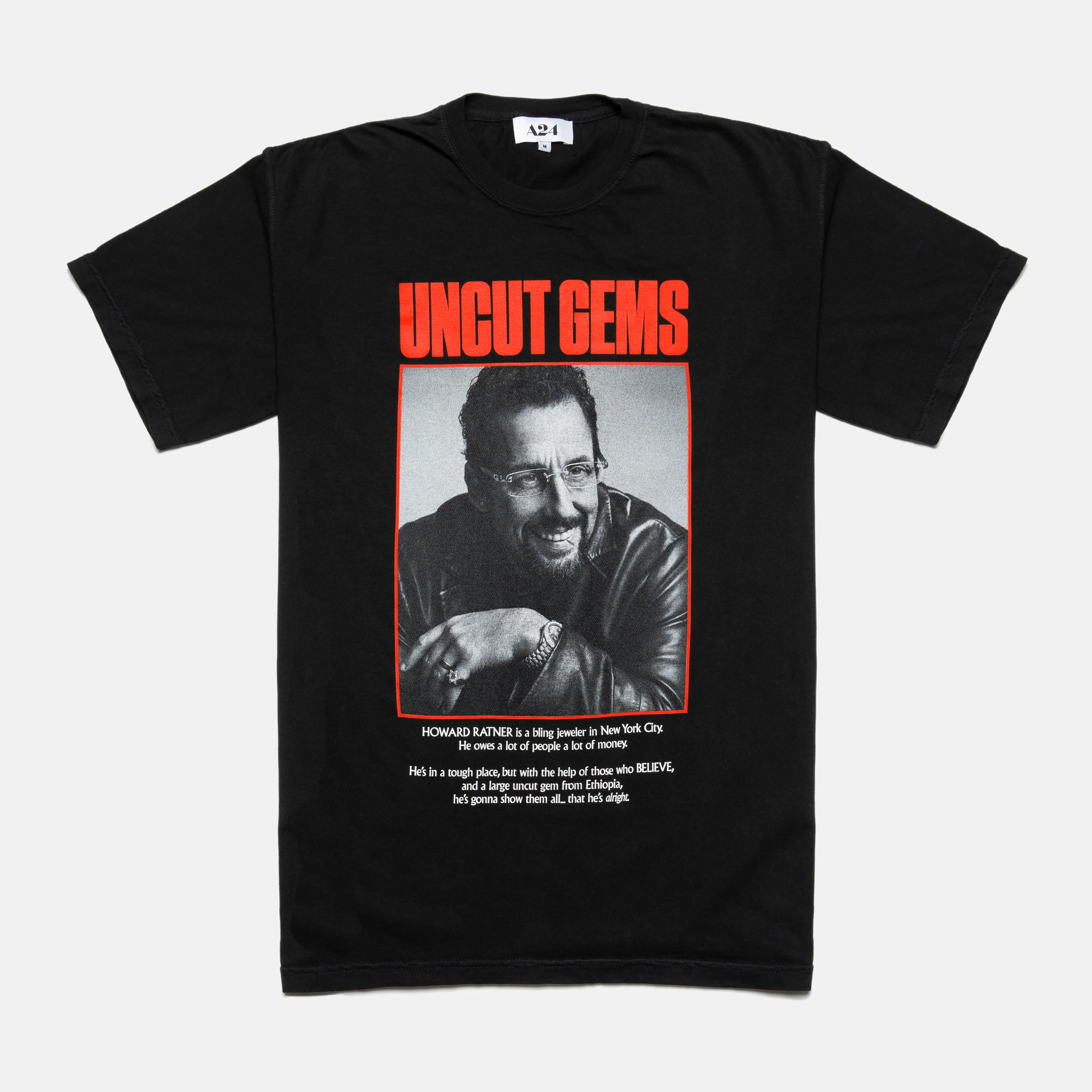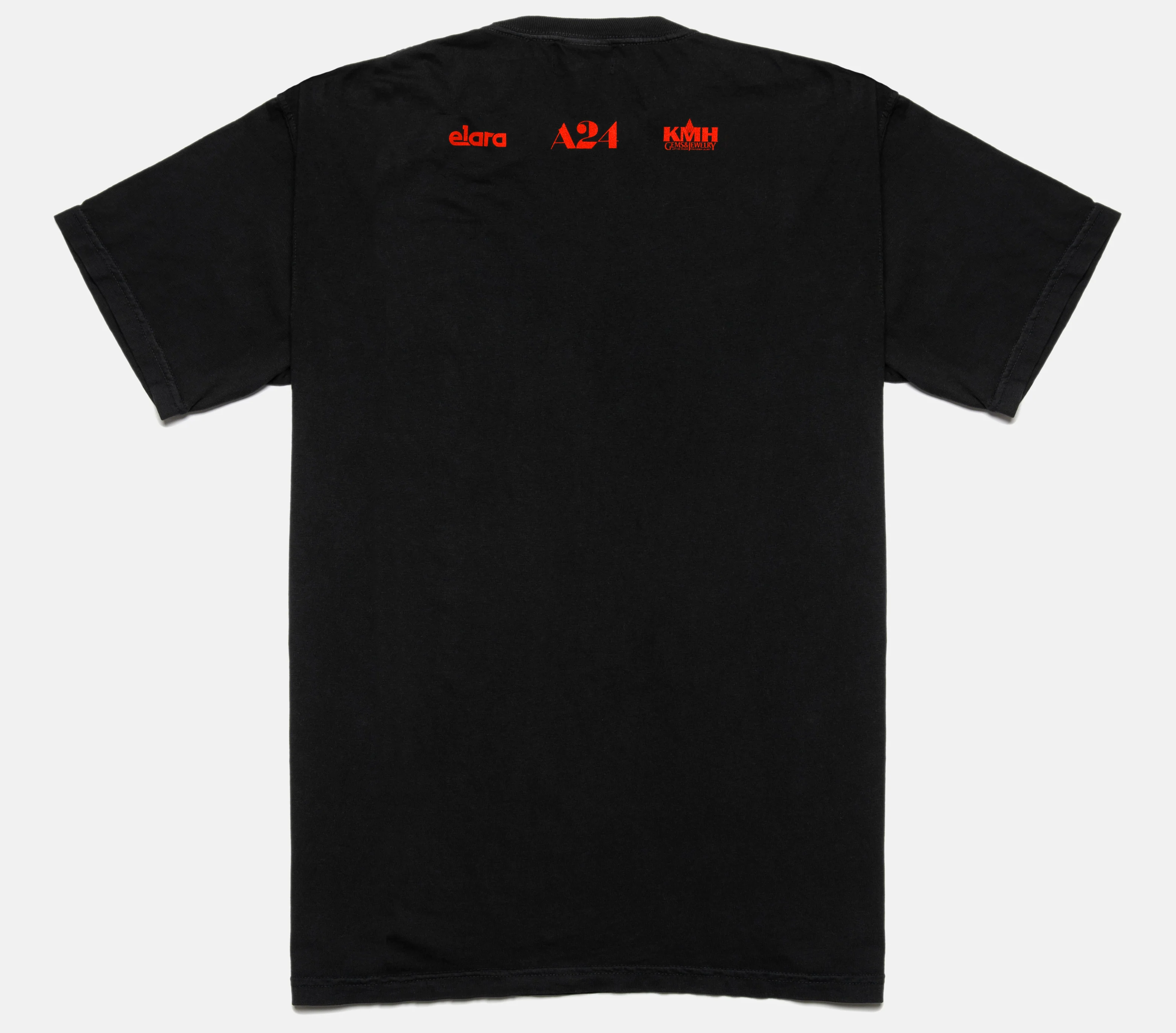 Black short sleeve cotton t-shirt with screenprinted image and text on front, logos on back, and A24 woven label inside.