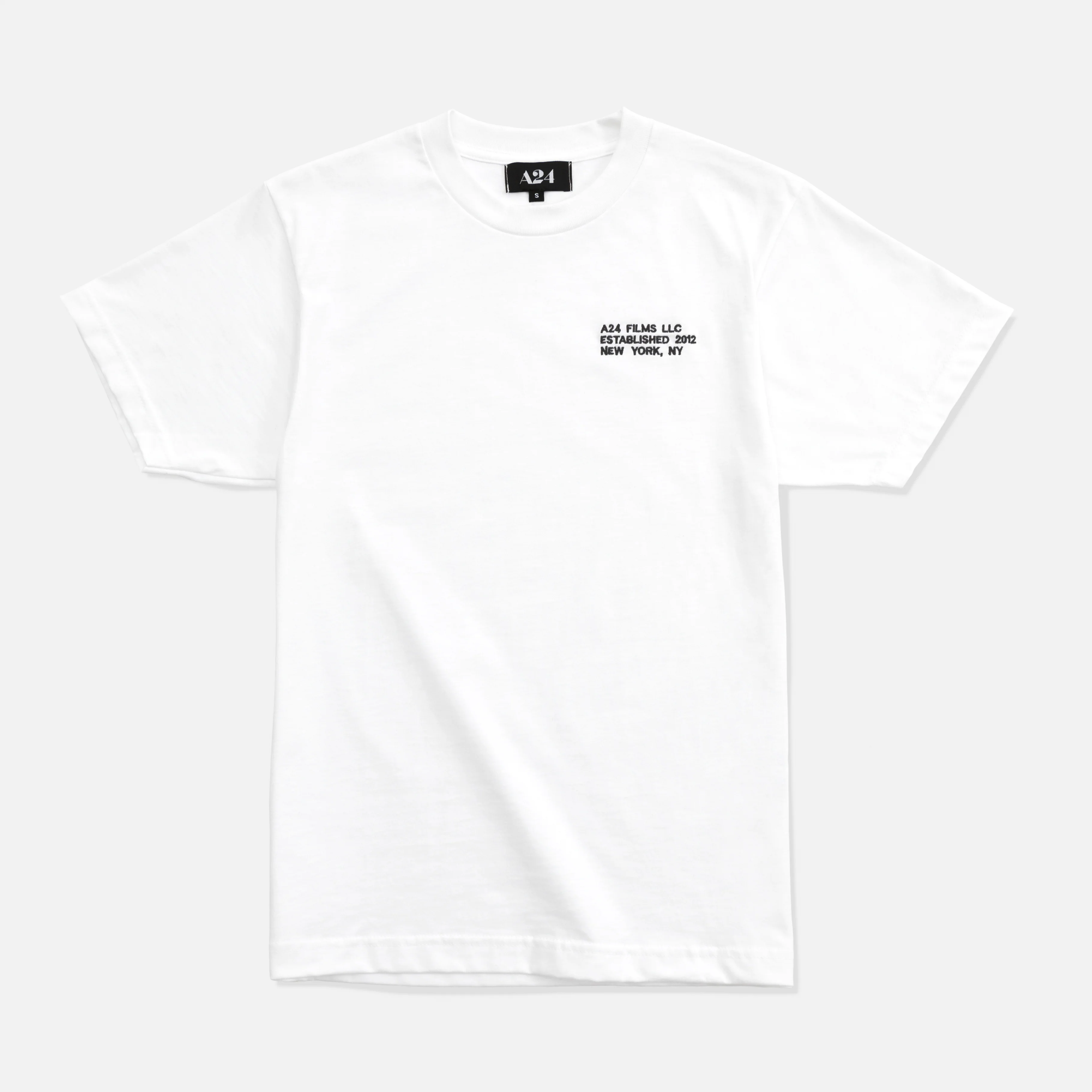White short sleeve cotton t-shirt with black embroidery on left chest and A24 woven label inside. Fits true-to-size.Ā